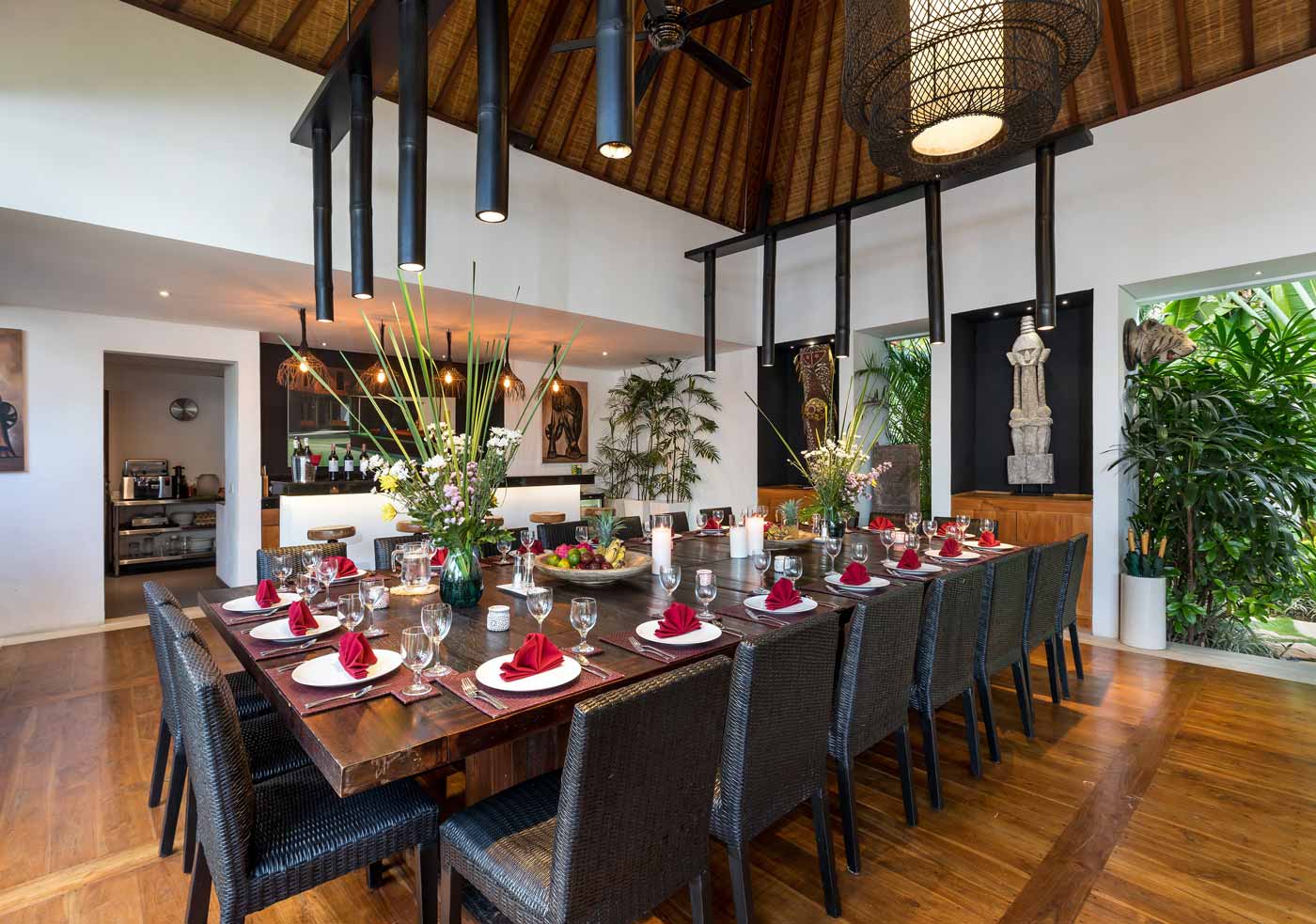 The 10bed villa also has two 10seater wooden dining tables in the two living room pavilions that can become one 24pax dining area.