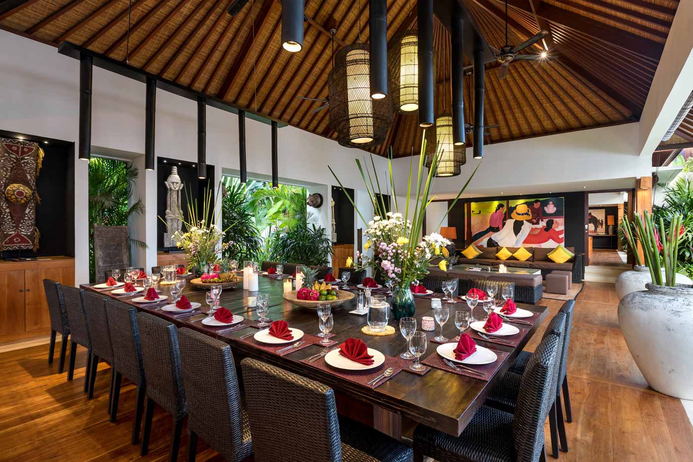 The 10 bedroom villa has two 10seater wooden dining tables in the two living room pavilions. If, however, you wish to eat together, we can combine the two dining tables and have a 20pax dining area. Maximum capacity including extra seating is 24 pax.