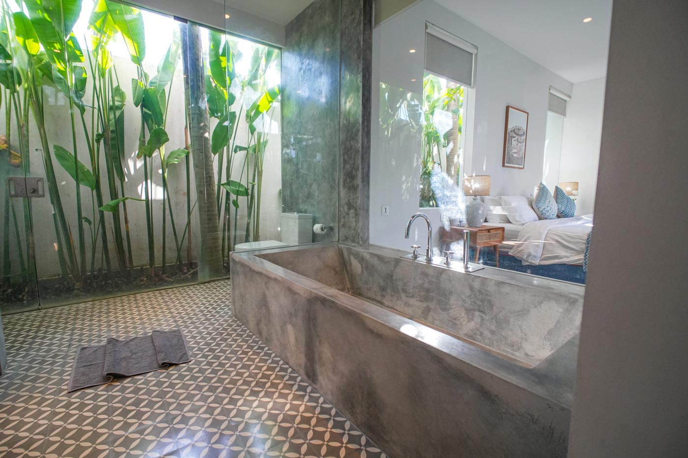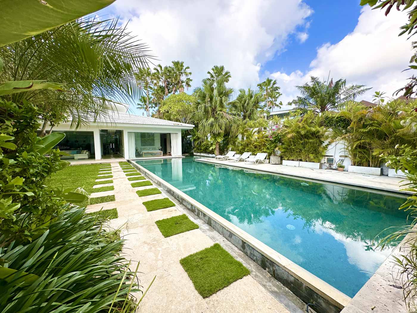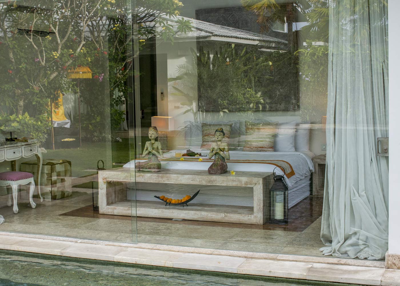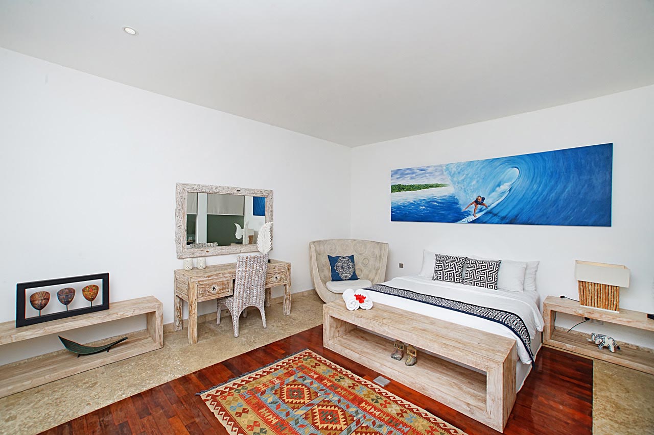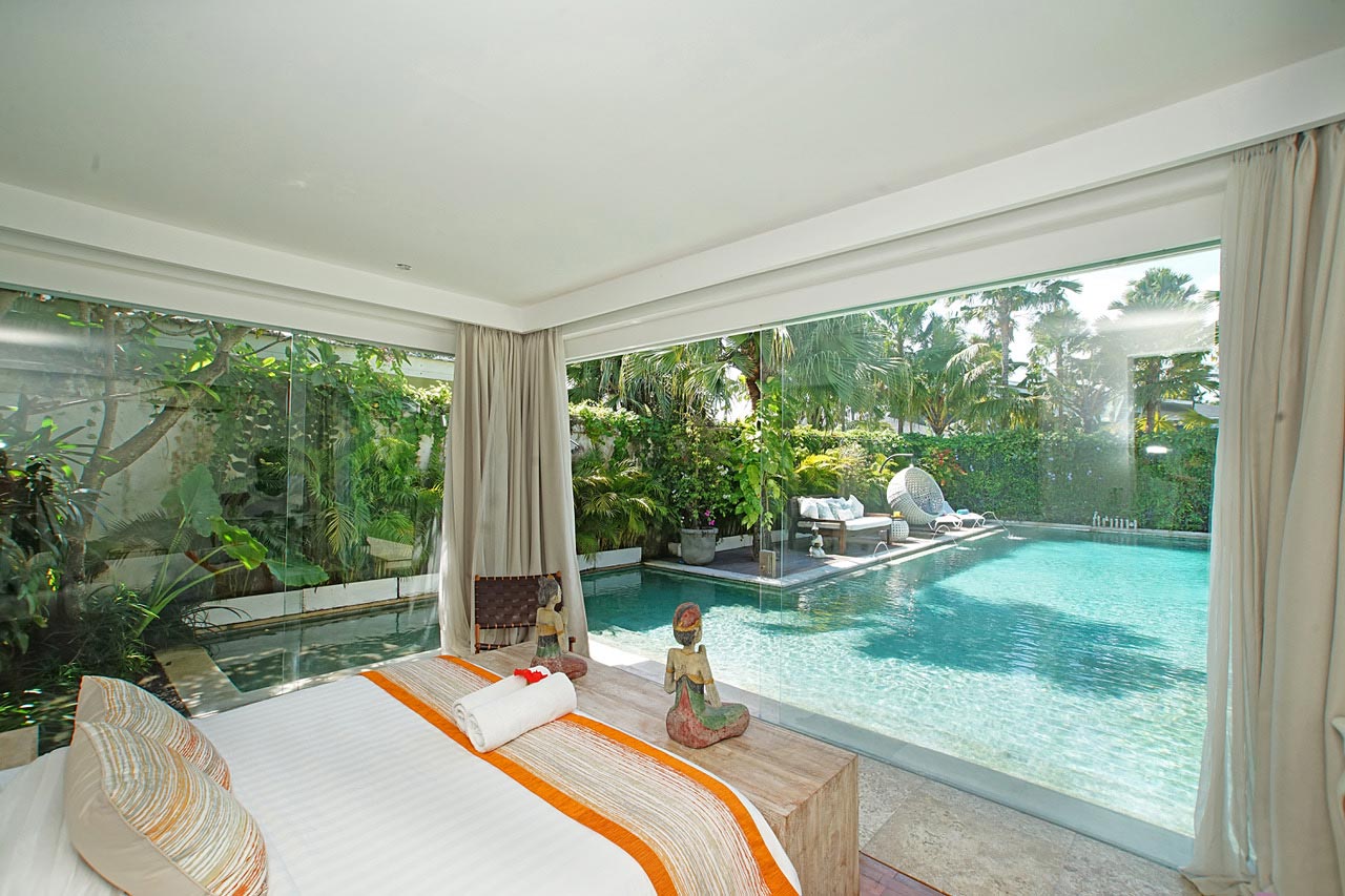 There’s something for everyone here. There are two ultra glam master suites with large dressing rooms and stunning views for whoever baggsies them first. The master suite at Desa Berawa is located upstairs and features a huge private balcony with garden views, a large seating area, a lawn and a swing. The master suite at Jumah opens up right into the pool via glass sliding doors, so you can dive in right from your room. Both have smart TVs.