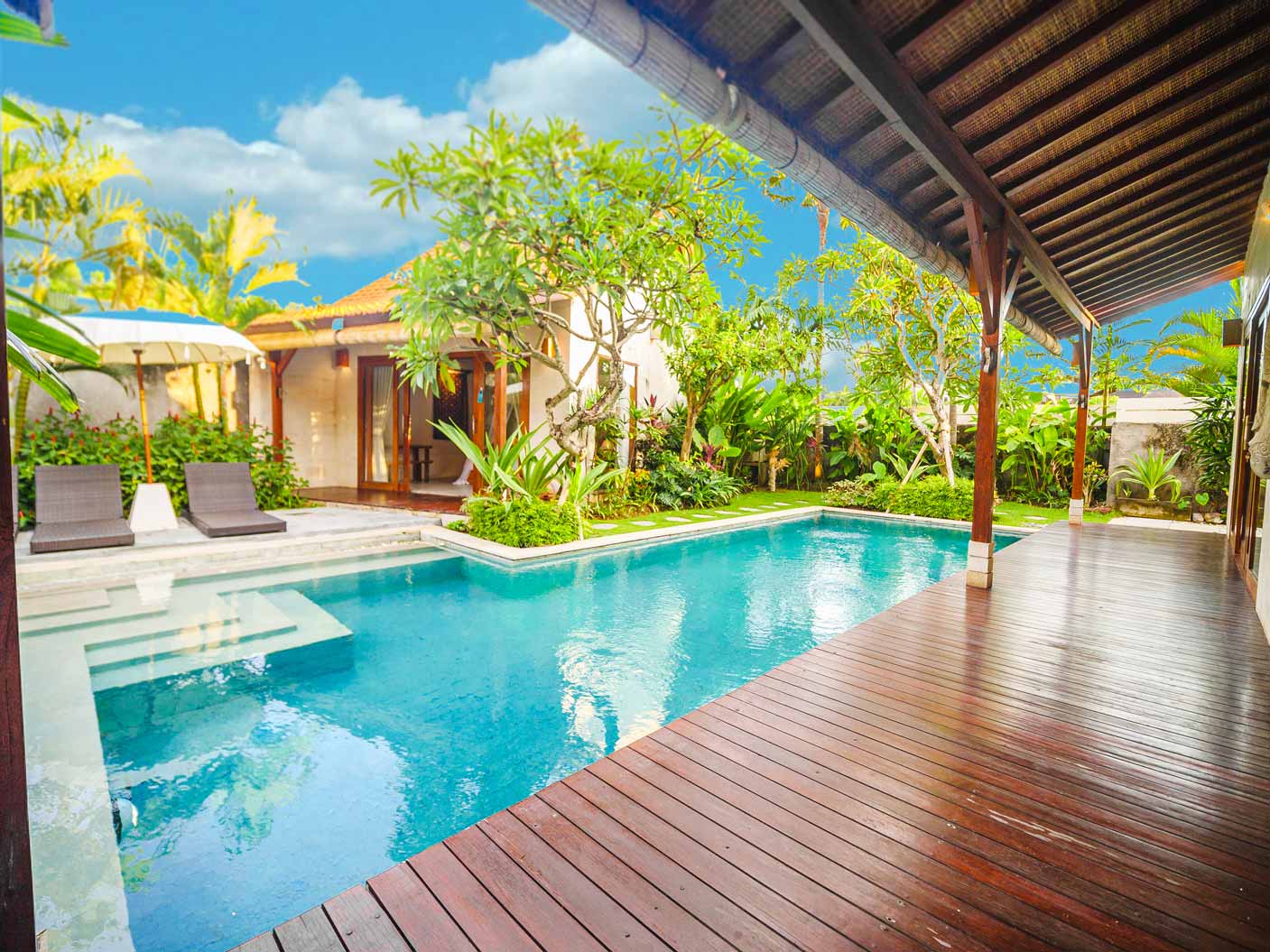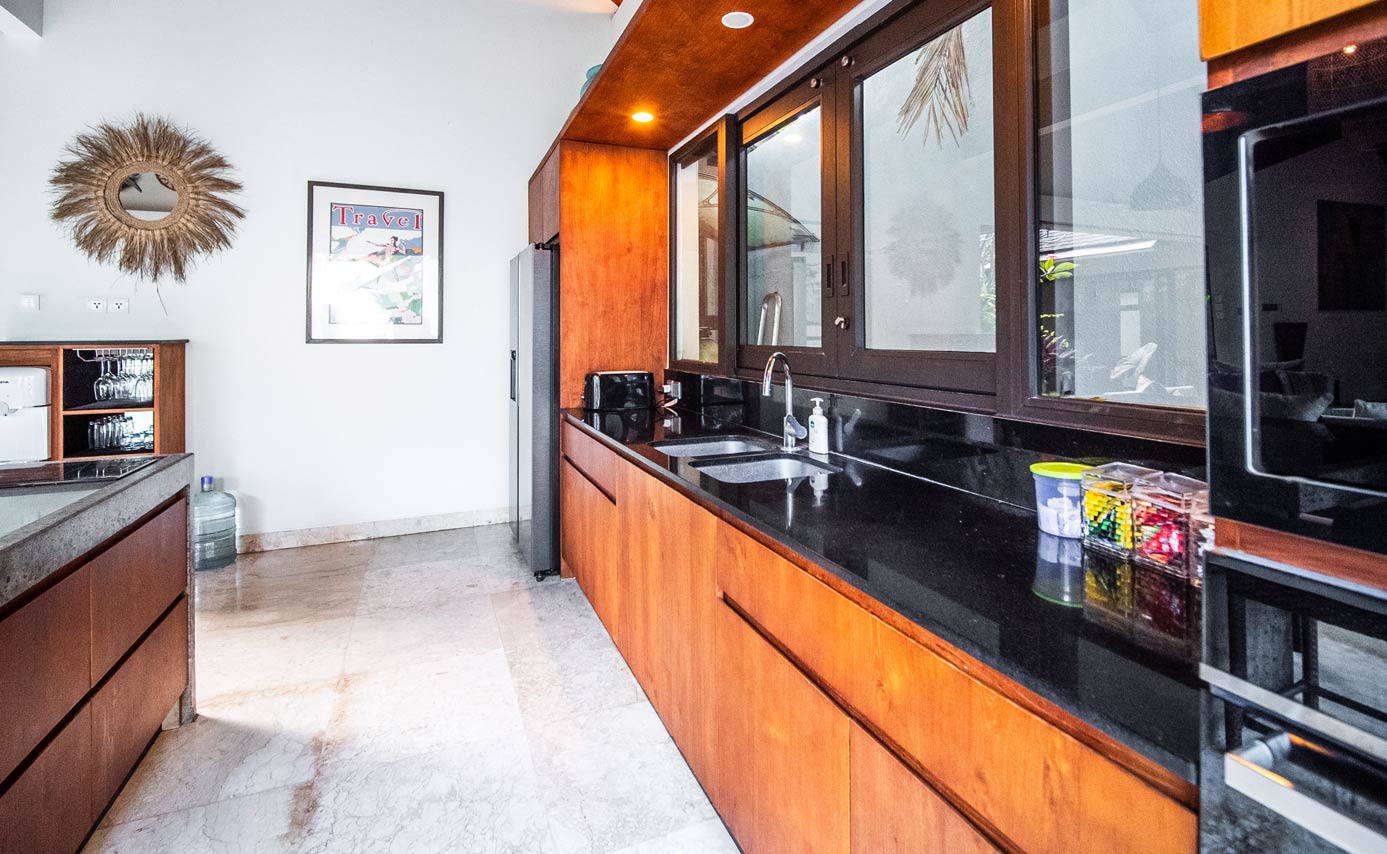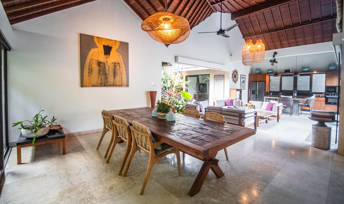 Marton 3 bedroom villa just next door has all luxury you can wish for. We are talking a private pool, an indoor dining and living room area with smart TV, Western fully equipped kitchen, TV room with pool table, a portable massage bed, 3 outdoor lounge areas and a wooden bar table with stools. There are 3 bedroom suites. Each has king size beds, AC, ceiling fan, side tables, reading lamps, spacious closets, deposit boxes, black out curtains, timber venetians and mosquito screens. Each bedroom has an en-suite luxury bathroom. These have freestanding bathtubs, showers and twin vanities. 2 out of the 3 king size bedrooms can be converted into twin rooms.