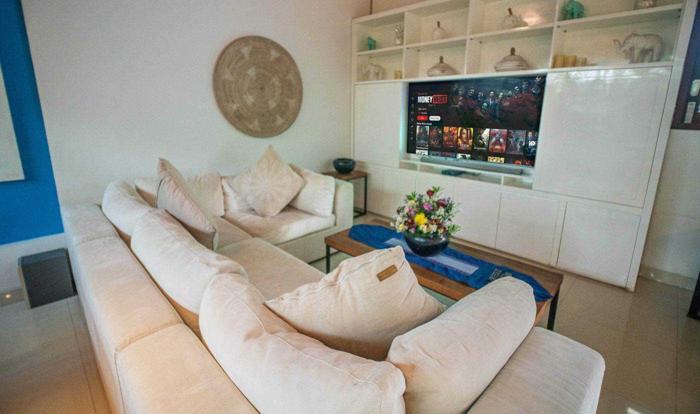 Karang 3 bedroom villa is located 100 metres away and has nothing to envy from the other villas. Fully equipped with a private pool, living room, dining area and of course a TV room, it has 3 bedroom suites. 2 out of the 3 king size bedrooms feature smart TVs, while all have en-suite luxury bathrooms. One king size bedroom suite can be converted into a twin bedroom.
