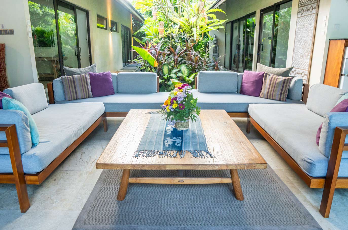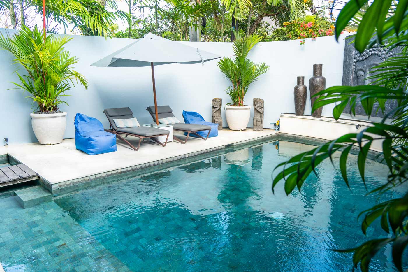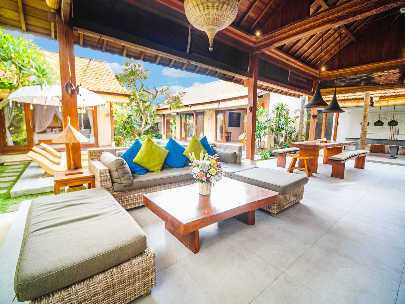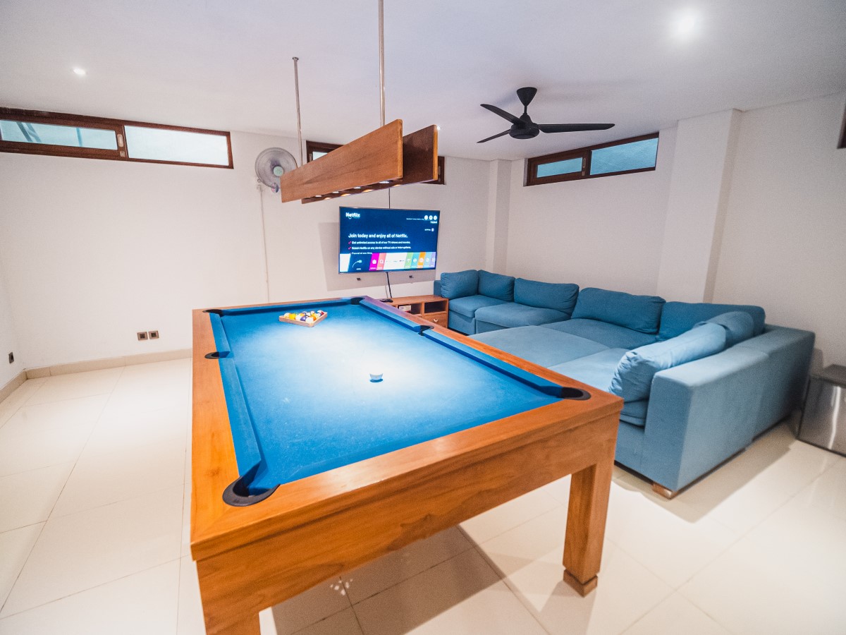 At Karang + Marton + Tamantis 15 bedroom villa, we promise you impeccable service and lots of friendly smiles. Additionally, we promise you 5 private pools, 4 pool tables, 2 TV rooms, living rooms, dining areas, 2 western style kitchens, 3 kitchenettes. And all of these within walking distance to the beach, Atlas, Finns and the trendy cafés and restos of Berawa.
