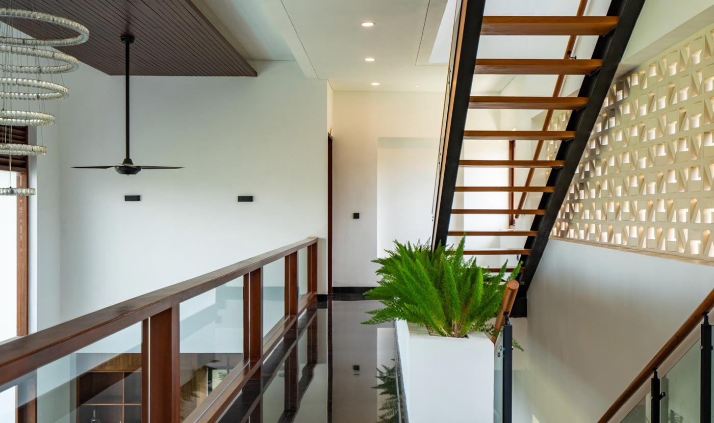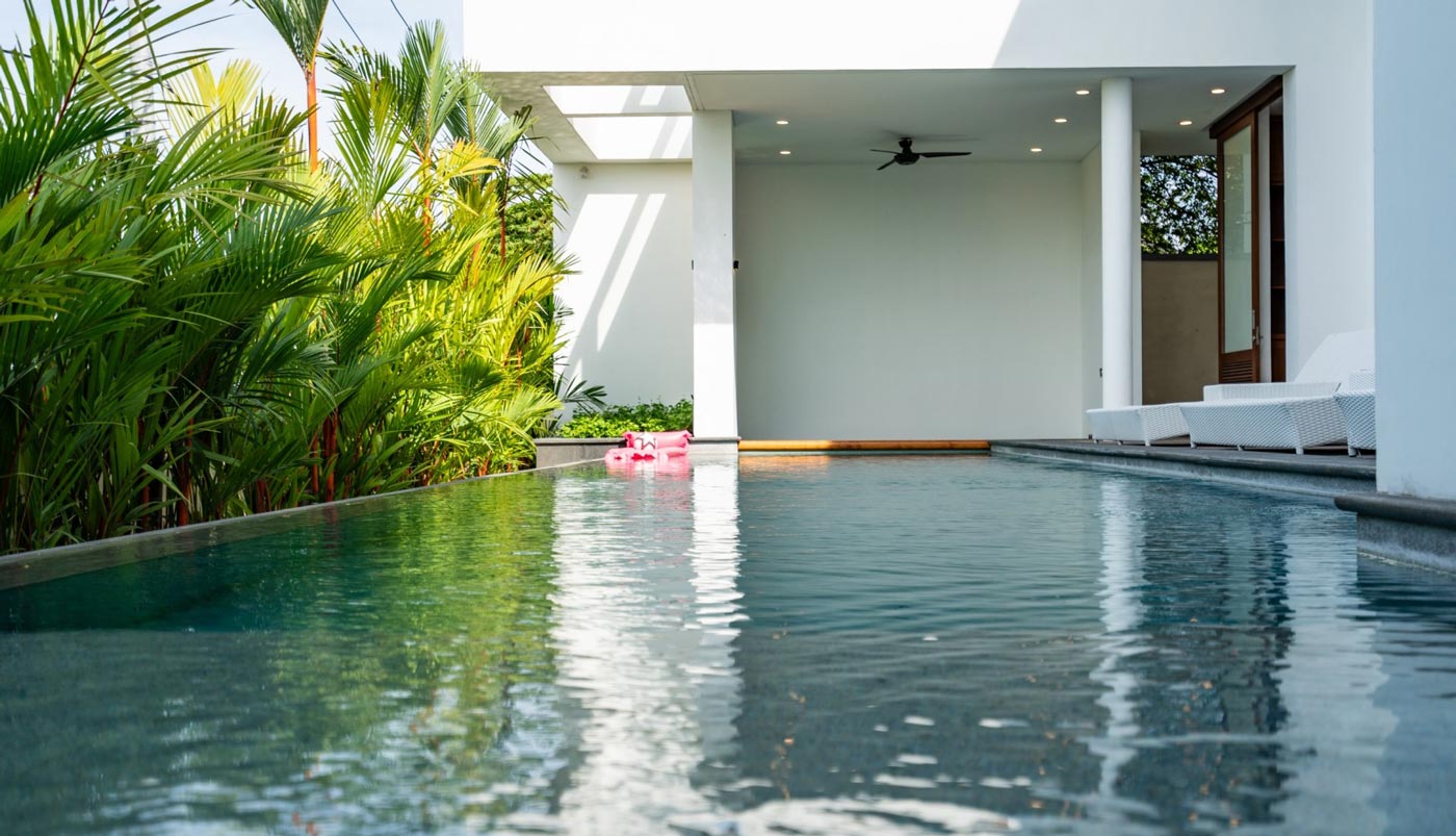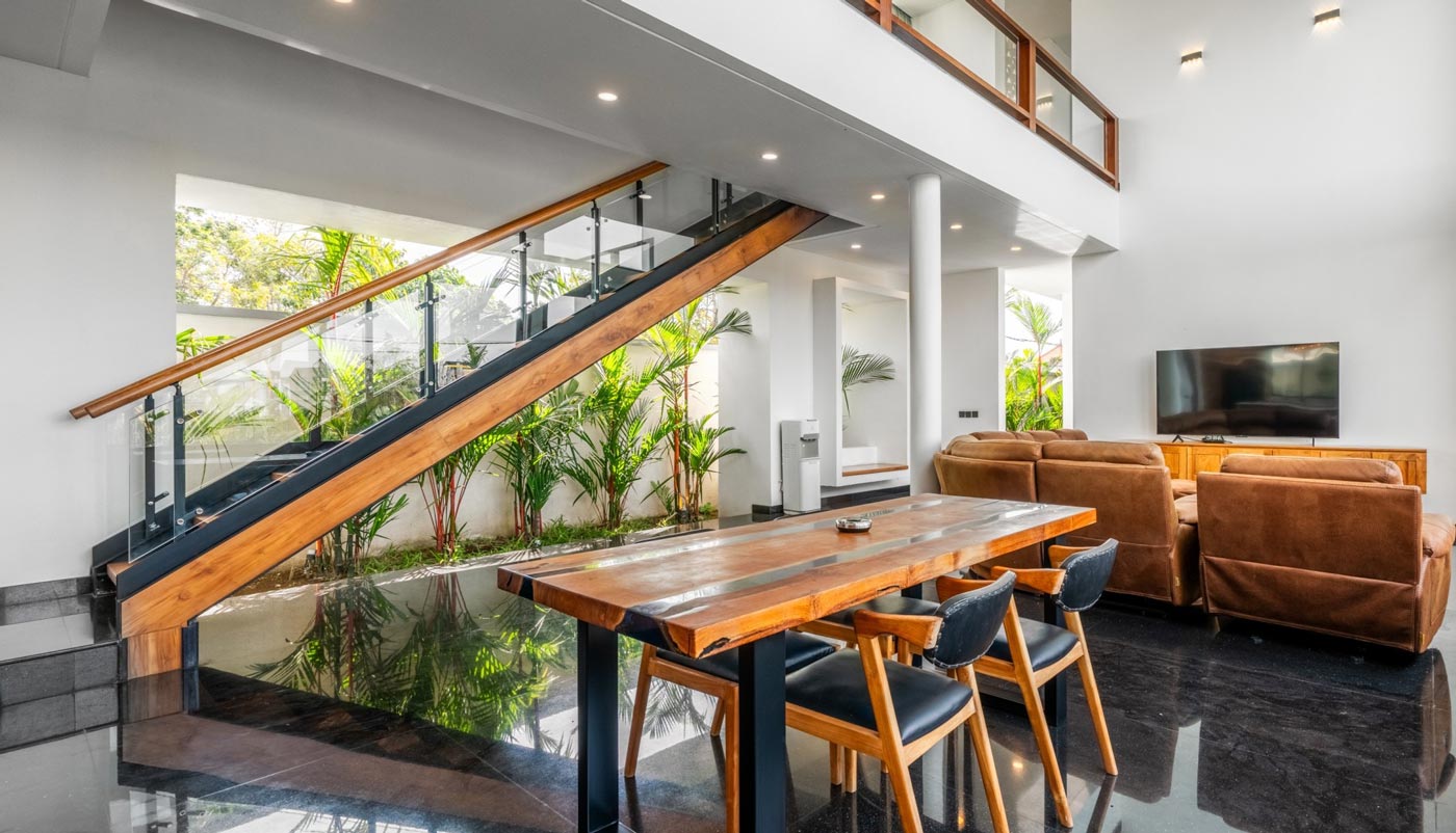 At the centre of the villa sits a striking glass-edge infinity pool with a sunken lounge and sunbeds. It naturally becomes the heart of your stay — slow mornings with coffee by the water, relaxed afternoons under the sun, and easy conversations that stretch into the evening. The landscaped garden and outdoor shower complete the setting, giving the entire space a resort-like feel without losing its privacy.