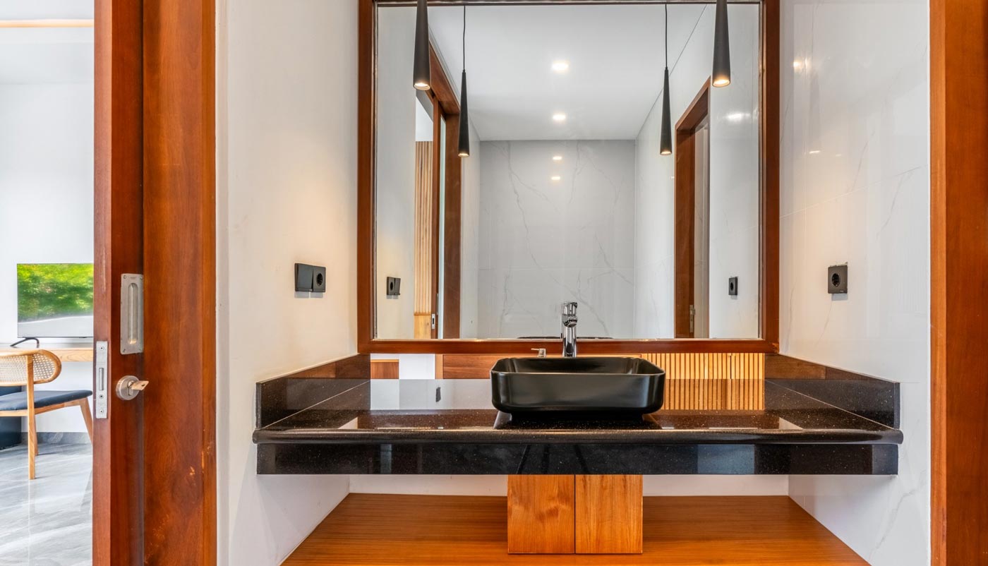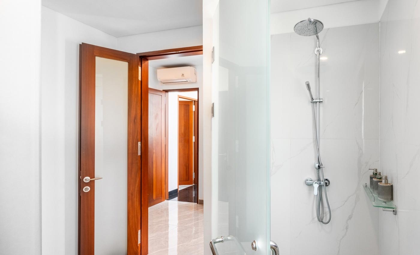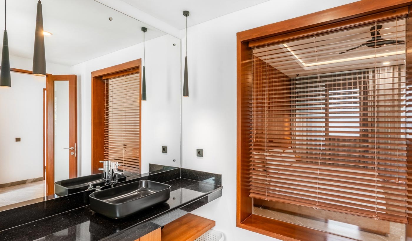 Each of the five air-conditioned bedrooms is designed as its own retreat. King-size beds, en-suite bathrooms, private balconies, and thoughtful in-room amenities provide comfort and privacy for every guest. The master suite includes a spacious bathtub for slower evenings, while every bedroom is equipped with its own television, mini fridge, kettle, safe, and desk.
