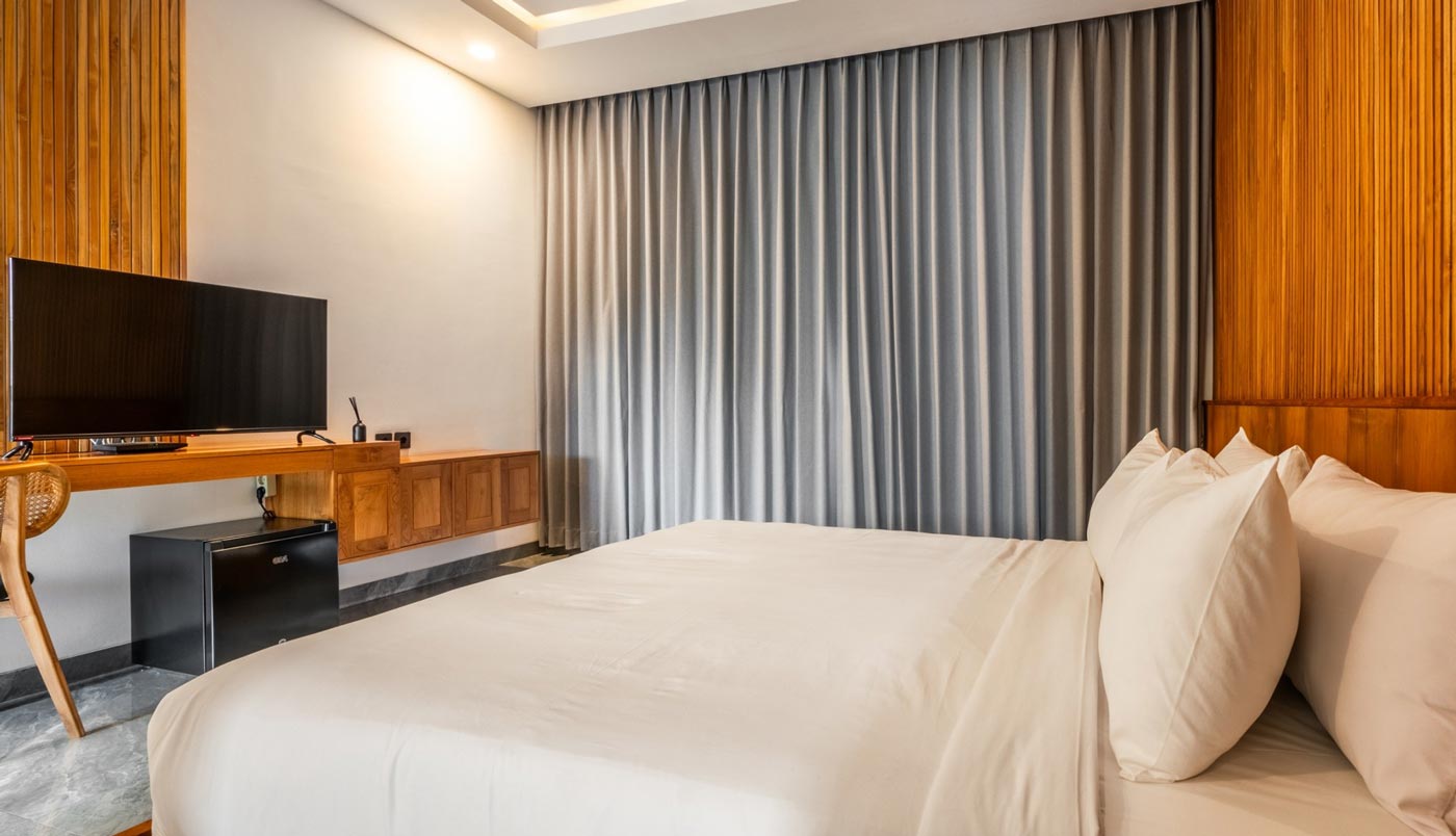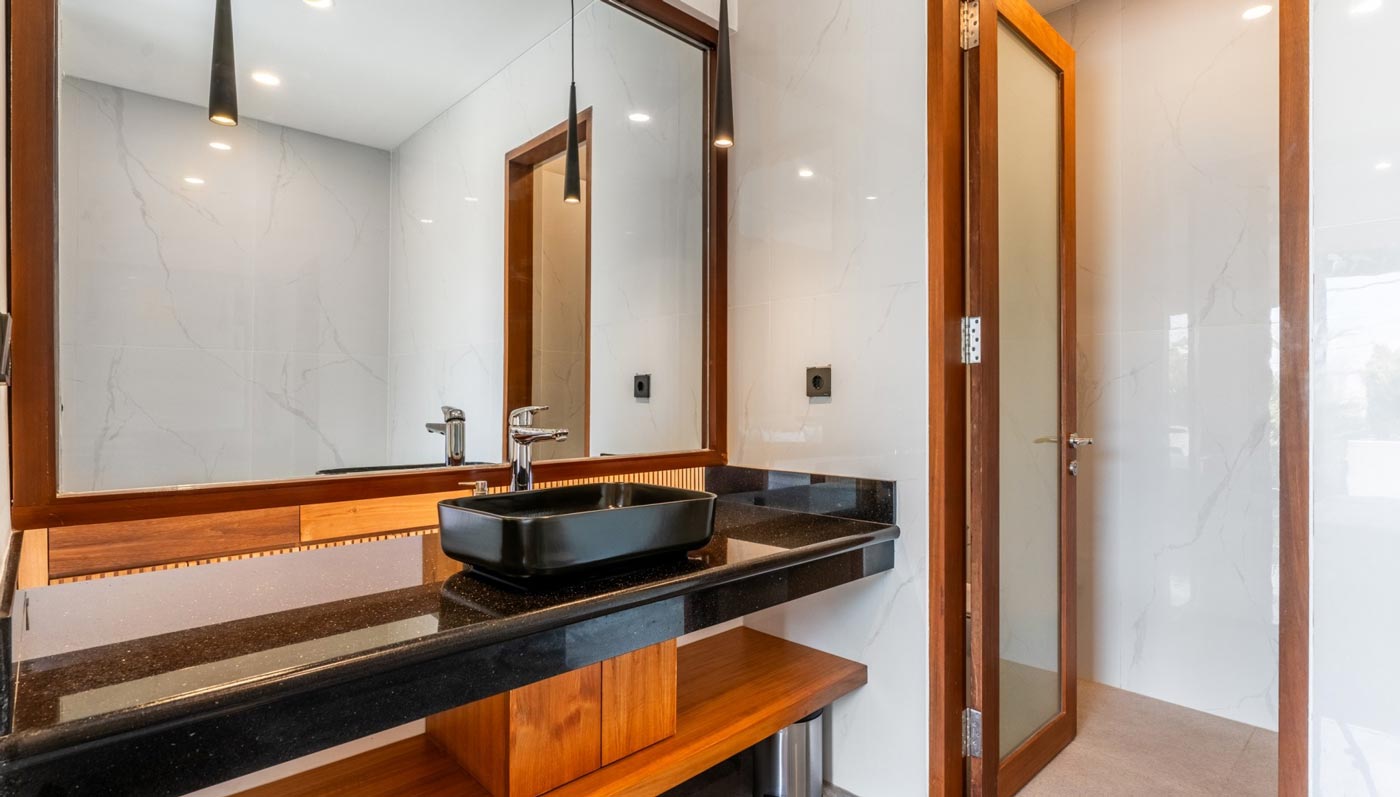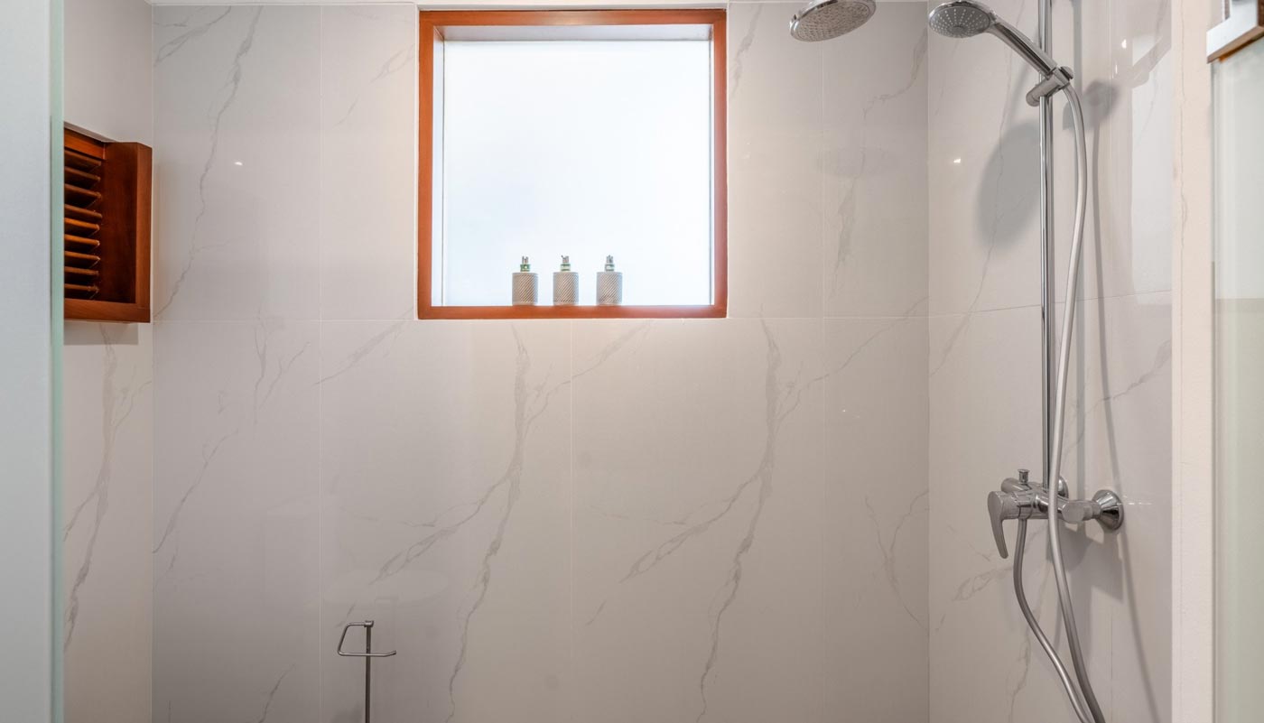 Each of the five air-conditioned bedrooms is designed as its own retreat. King-size beds, en-suite bathrooms, private balconies, and thoughtful in-room amenities provide comfort and privacy for every guest. The master suite includes a spacious bathtub for slower evenings, while every bedroom is equipped with its own television, mini fridge, kettle, safe, and desk.