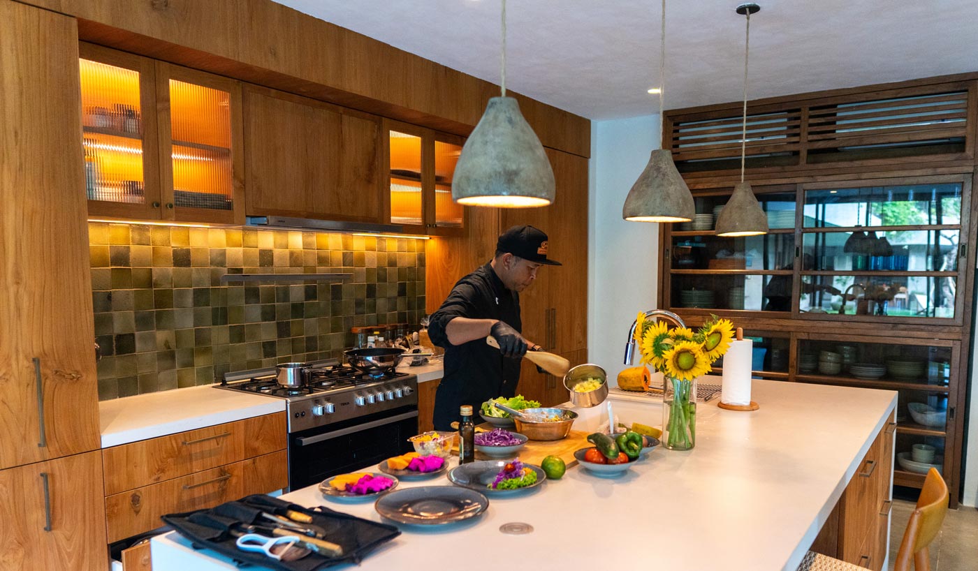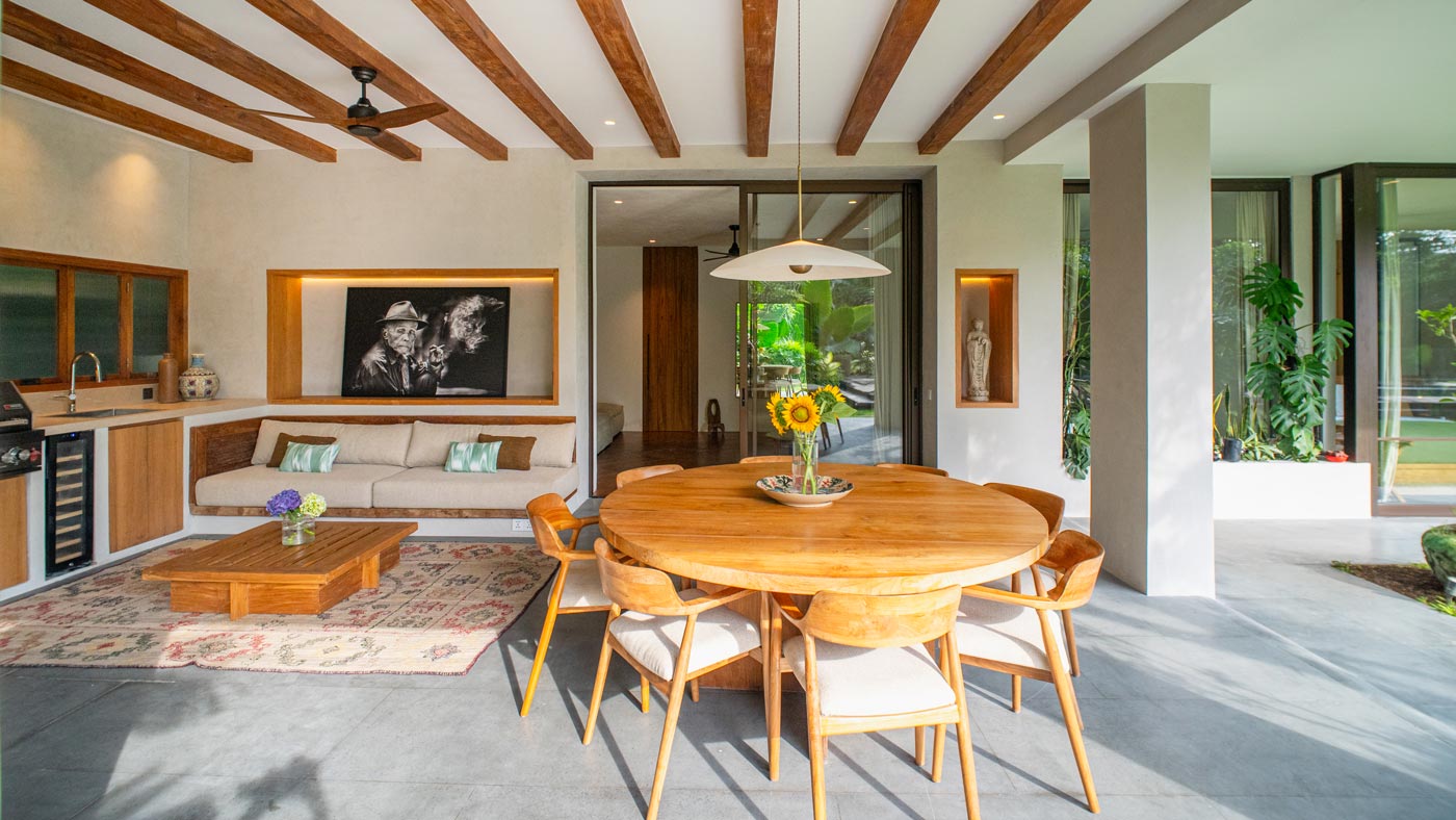 This villa holds a multitude of nooks, places to be alone, places to connect, places to reflect. All are thoughtfully dressed with hand picked art and décor using local craftsmanship and natural textures, bringing a sense of stillness. Hang out in the main living/dining area, the heart of the villa, with your favourite people, eating, drinking, talking, watching movies. Or take yourself to the veranda or your private bedroom terrace and enjoy the quiet. Book a massage – our master bedroom has its own massage bed. Or hole up cosily on the huge chaise in the media room.