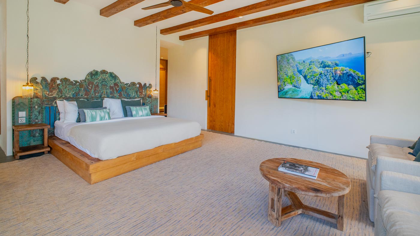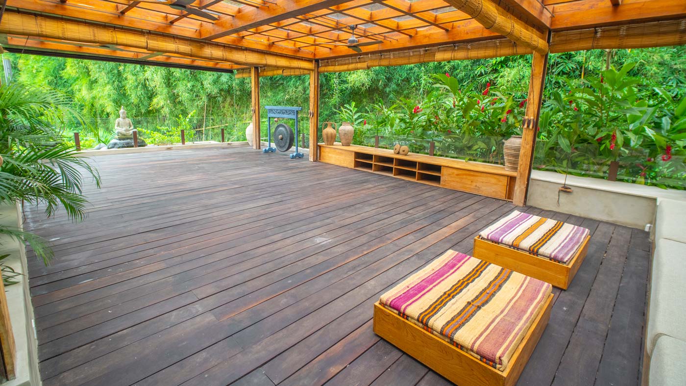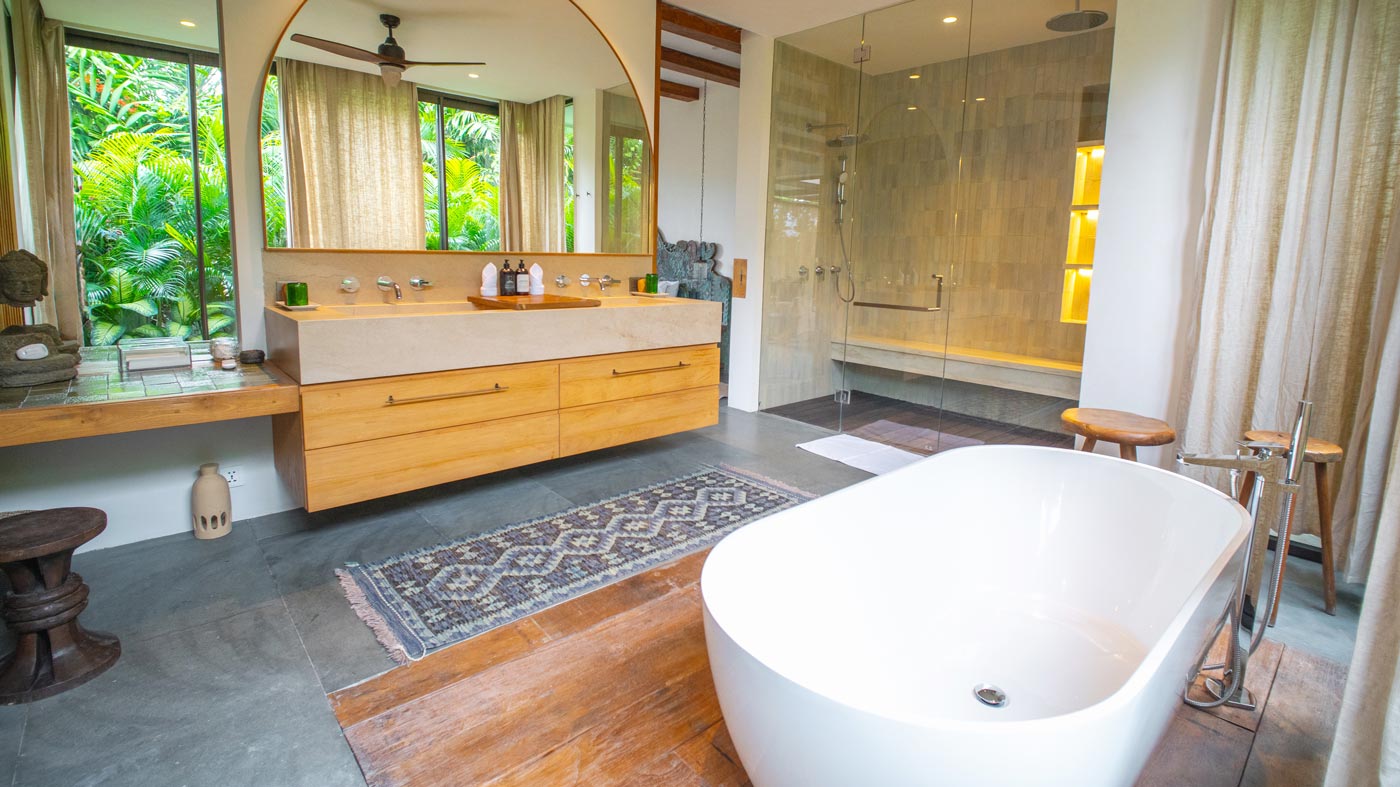 Wherever you sleep, you’ll have a restful night. The master bedroom is sublime. It has a large private terrace and full dressing room with extensive closet space. The master bedroom and all the standard bedrooms feature king sized beds and air conditioning. They also have a private bathroom with shower, plus a luxurious bath tub. This is positioned by floor to ceiling sliding windows looking out over the grounds and land beyond (there’s also a planter carefully positioned to protect your modesty). For the kids, the media room also converts into the fifth bedroom. This is a fun space of their own which also has its own bathroom with bath tub.