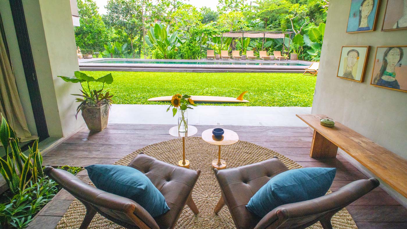 Loved this villa! Stunning interiors and exteriors. Great location right by the river. I am a yogi so I really appreciated the beautiful yoga shala with its gong– such a peaceful place to practice. My husband is an avid swimmer, and he loved that the pool was actually long enough for laps (so many villa pools are just splash pools!). Staff couldn’t have been more helpful. Definitely recommend taking surf lessons while you’re here — we went with Surfs Up Bali and they were awesome.