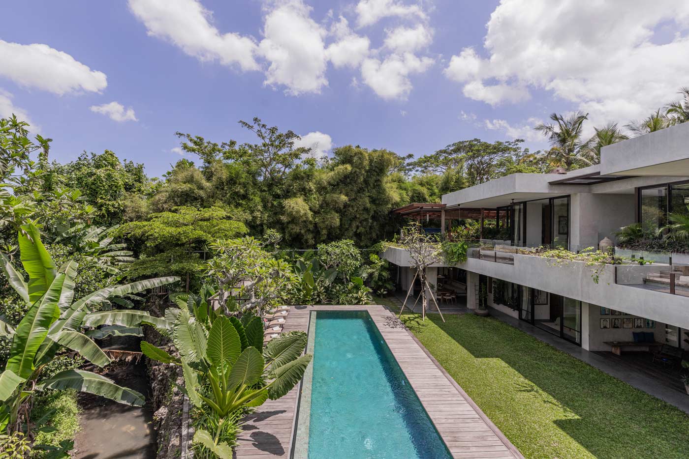 Welcome to paradise! You will feel your shoulders drop as soon as you take your first step inside this villa. Sliding glass walls throughout overlook the beautifully planted gardens, the river that flows by the property and the rice fields beyond, giving a sense of peace and expansiveness wherever you are. Start your day with sun salutations on the upstairs yoga shala. Breathe in the views and set your intent. Your floating breakfast is waiting for you, prepared by your private chef. Dry off on a sun lounger under a pergola framed with bougainvillea, among frangipani and lotus bowls.