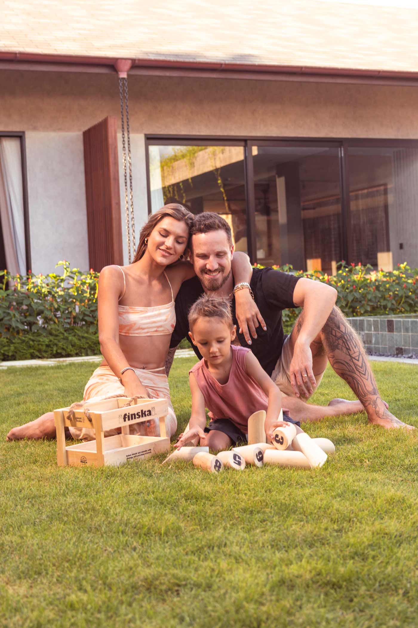 Outdoor living sits at the heart of the villa. A striking 15-metre swimming pool stretches across the garden. And it’s surrounded by open lawn space that’s rarely found in central Canggu. The wide grassy area creates a relaxed atmosphere for families and groups, whether it’s poolside lounging, casual garden games, or simply enjoying the tropical setting.