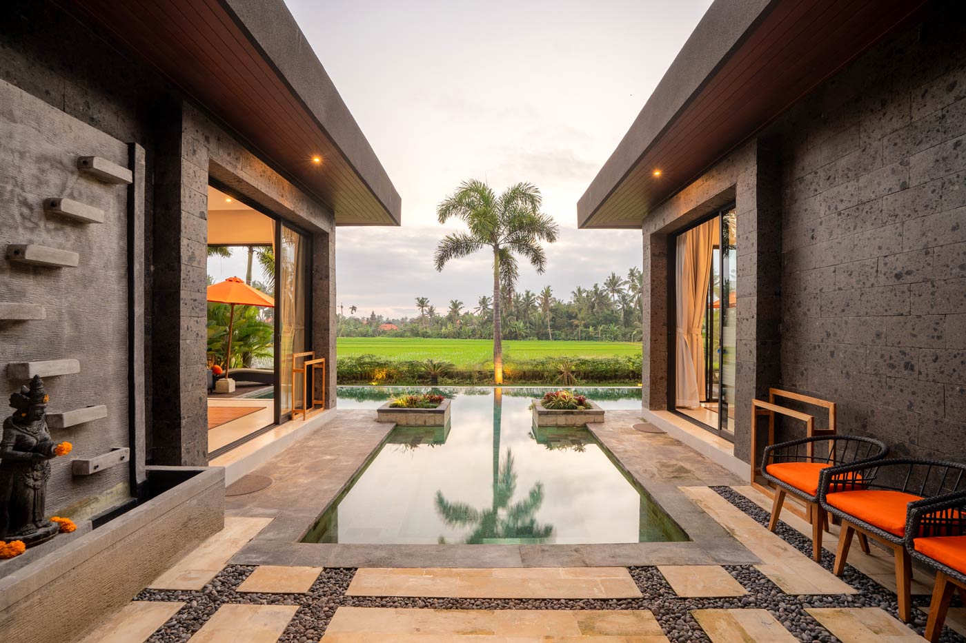 Sierra Vista2 3 bedroom villa is your perfect base for exploring Ubud. Just a 30-minute drive from this buzzing, evocative town, your villa offers you a peaceful retreat after a busy day. Lie back by your wrap-around infinity pool with your friends or family. Take in the stillness and quiet among the unbroken views over rice fields to the palm trees beyond.