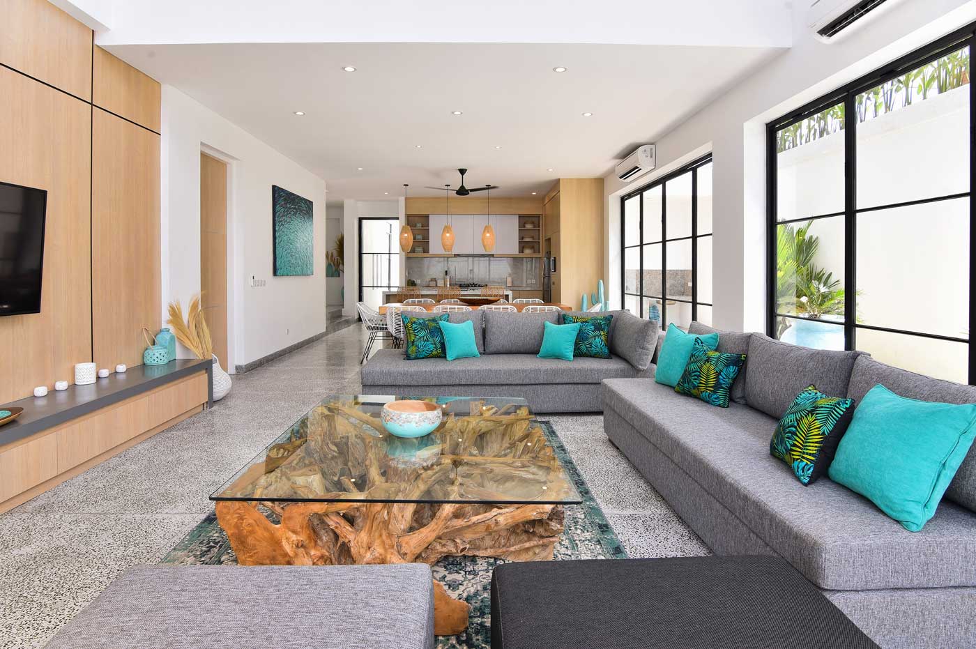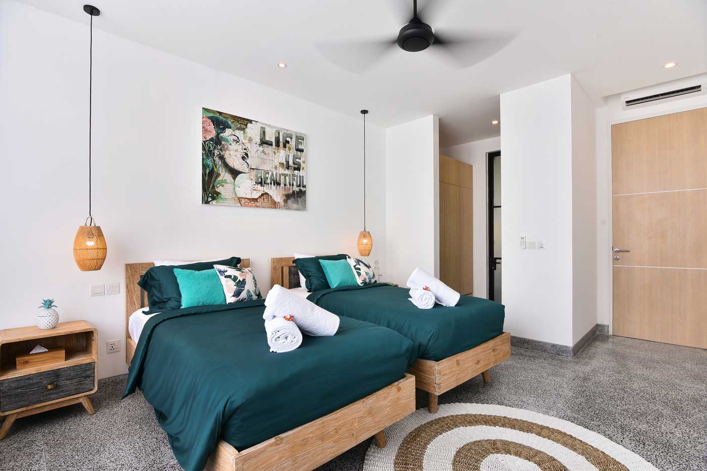The villas themselves are interconnected via a garden door, while each is independent with its one pool, open concept living space that features a dining area, lounge with smart TV with Netflix and a modern kitchen. Around the pool lies a barbecue space and a shaded chill space. As for the bedroom suites, the first villa has three king size bedrooms and one twin bedroom, while the other villa has three double (one king and two queen size) and one twin bedroom. Needless to say that all bedrooms have AC, ceiling fan, built in wardrobes, office space, en-suite luxury bathrooms and some have private lounge spaces and balconies. The master bedrooms (one per villa) are larger in size and have a bathtub in the en-suite bathroom.