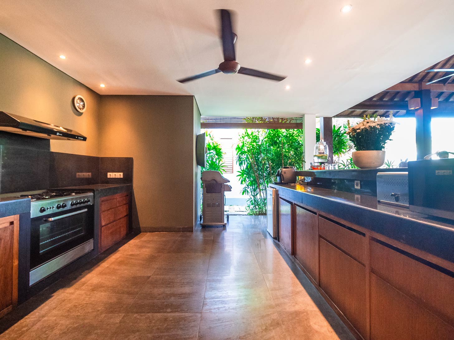 The villas have two 8seater wooden dining tables in the two living room pavilions. If, however, you wish to eat together, we can combine the two dining tables and have a 24pax dining area.