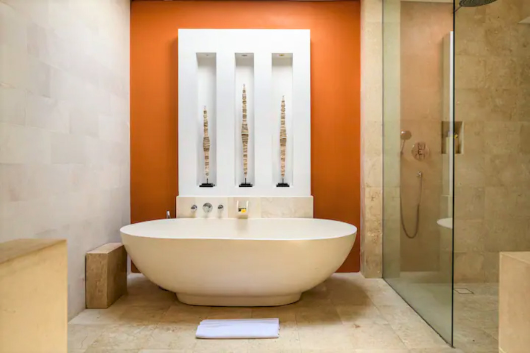 Your perfect base for exploring the best of buzzing Seminyak, this oasis of calm is the ideal villa for a large group to enjoy a fun and relaxing holiday. There’s plenty of private space for everyone, with seven bedrooms each in a separate pavilion building, laid out along each side of the pool, all with direct pool and garden access. There’s six double bedrooms and one bedroom with two double beds – take your pick! If you’re a family, note that one of the double bedrooms connects to the one bedroom with two double beds to form a family suite. You might need to toss for who gets the master suite though: this is very spacious and boasts a super king bed, office space, and a bath tub as well as two rain showers.