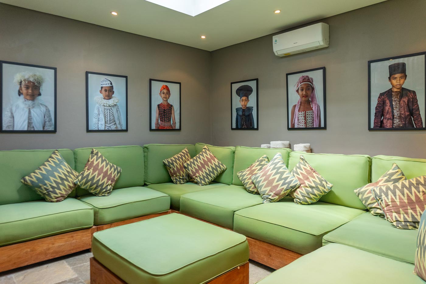 When you all want to get together, we’ve also got you covered. The pool and garden area is huge – this villa is on a 1.400sqm plot, and features a traditional Javanese gladak structure with daybeds set up for you to enjoy a massage. When it comes to meals, if you want to stay in there’s a fully equipped kitchen – but we’ve also provided you with a chef. Enjoy your meal at the dining table with its view over the garden, or kick back with some music in the adjacent living room. Afterwards, maybe some of you would like to set up for the evening in our private air conditioned TV room where you can watch movies (we’ve got Netflix and we’ve got DVDs) on the large flatscreen smart TV – or if you fancy a more analogue evening, we’ve also got a great choice of board games and books.