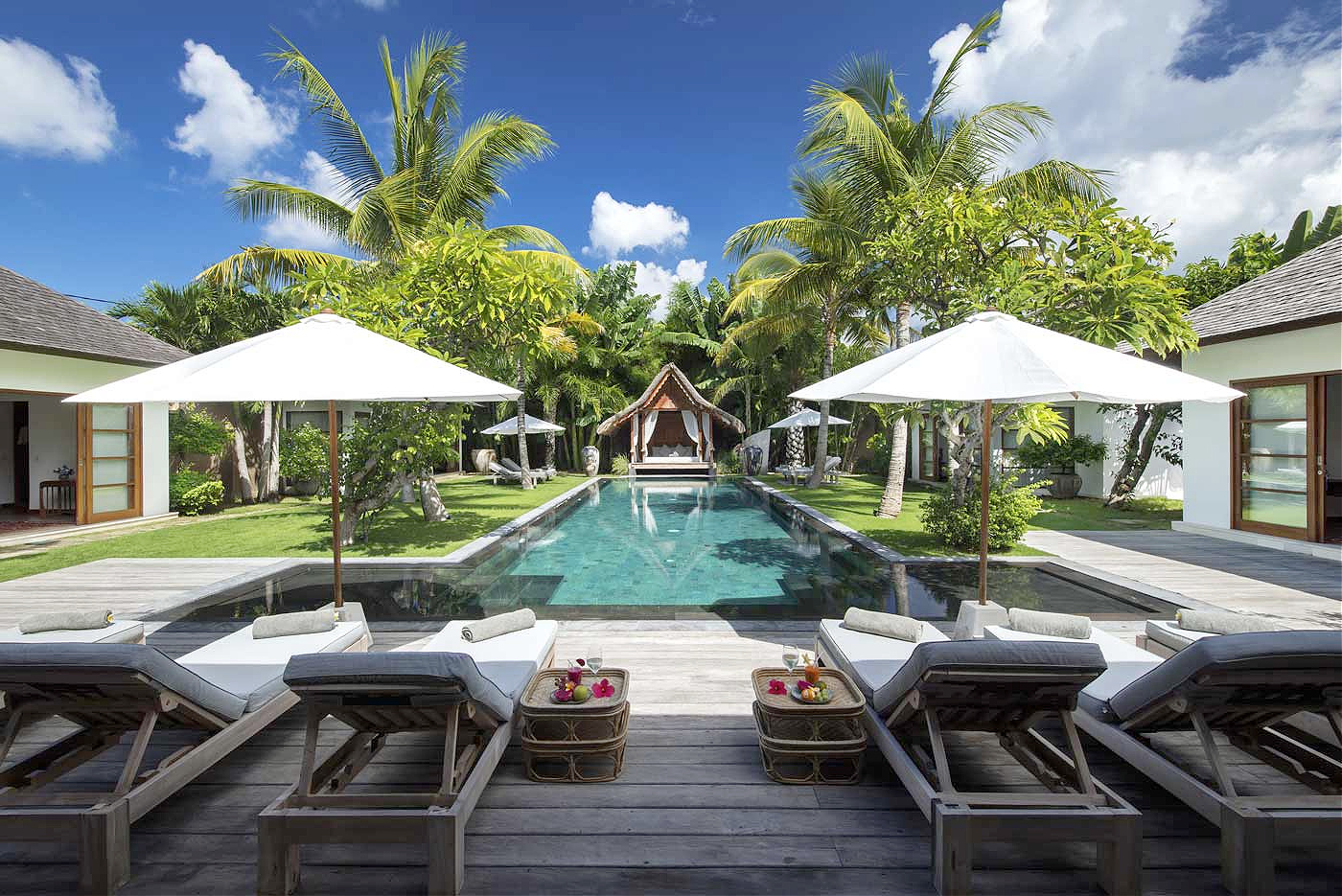 Your perfect base for exploring the best of buzzing Seminyak, this oasis of calm is the ideal villa for a large group to enjoy a fun and relaxing holiday. There’s plenty of private space for everyone, with seven bedrooms each in a separate pavilion building, laid out along each side of the pool, all with direct pool and garden access. There’s six double bedrooms and one bedroom with two double beds – take your pick! If you’re a family, note that one of the double bedrooms connects to the one bedroom with two double beds to form a family suite. You might need to toss for who gets the master suite though: this is very spacious and boasts a super king bed, office space, and a bath tub as well as two rain showers.